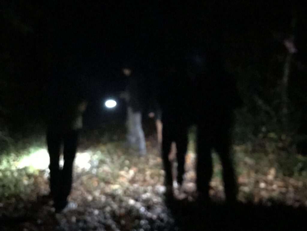 Mais que faisons-nous dans les bois sur ce sentier à la lumière de nos torches ? Est-ce d’avoir vu Kamelott au cinéma la veille qui donne à certains l’envie de poursuivre une quête ?