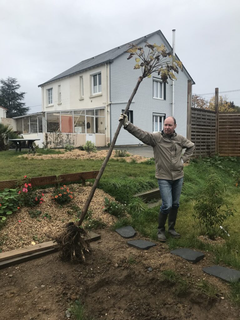 Alors aujourd’hui, presqu’un an après. c’est le jour J : déterrer les arbres, vérifier le creusement des trous, terminer certains drainages, planter un albizia ici, un abricotier là, ailleurs un catalpa ou un parrotia.