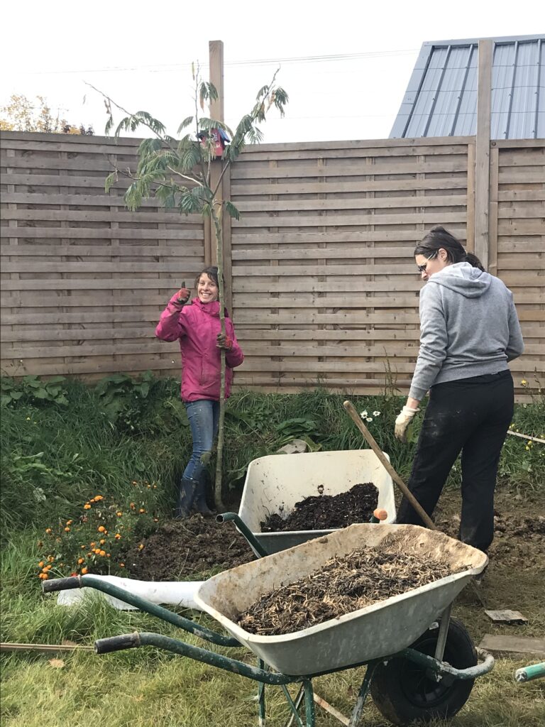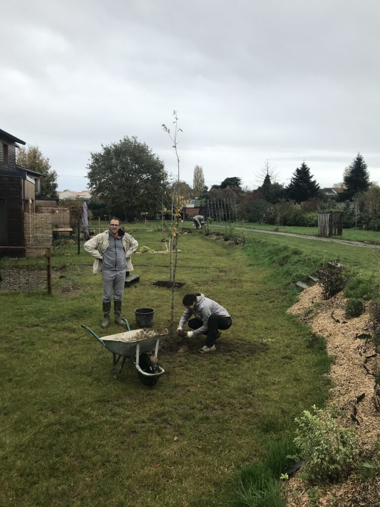On s’en souvient de cette journée d’automne 2024 !!! sol détrempé…impossibilité de planter les arbres de nos jardins privés côté sud…décision de les mettre en nourrice pour un an côté nord…