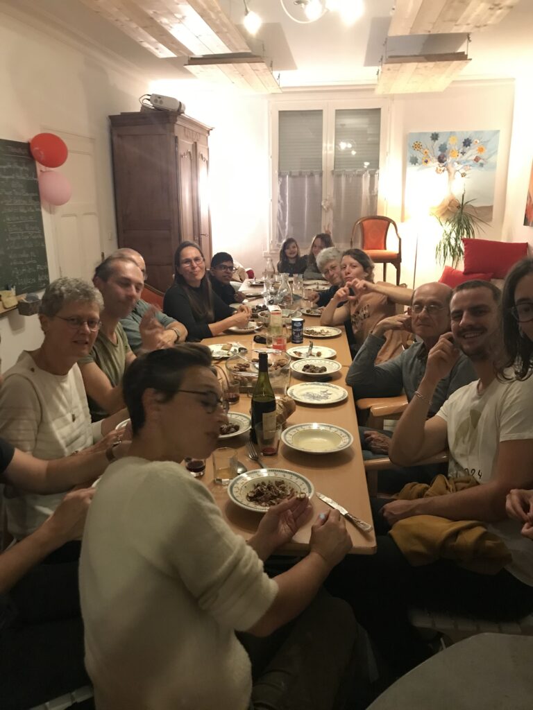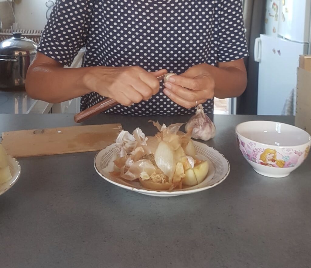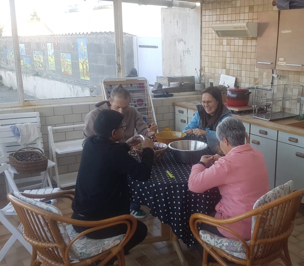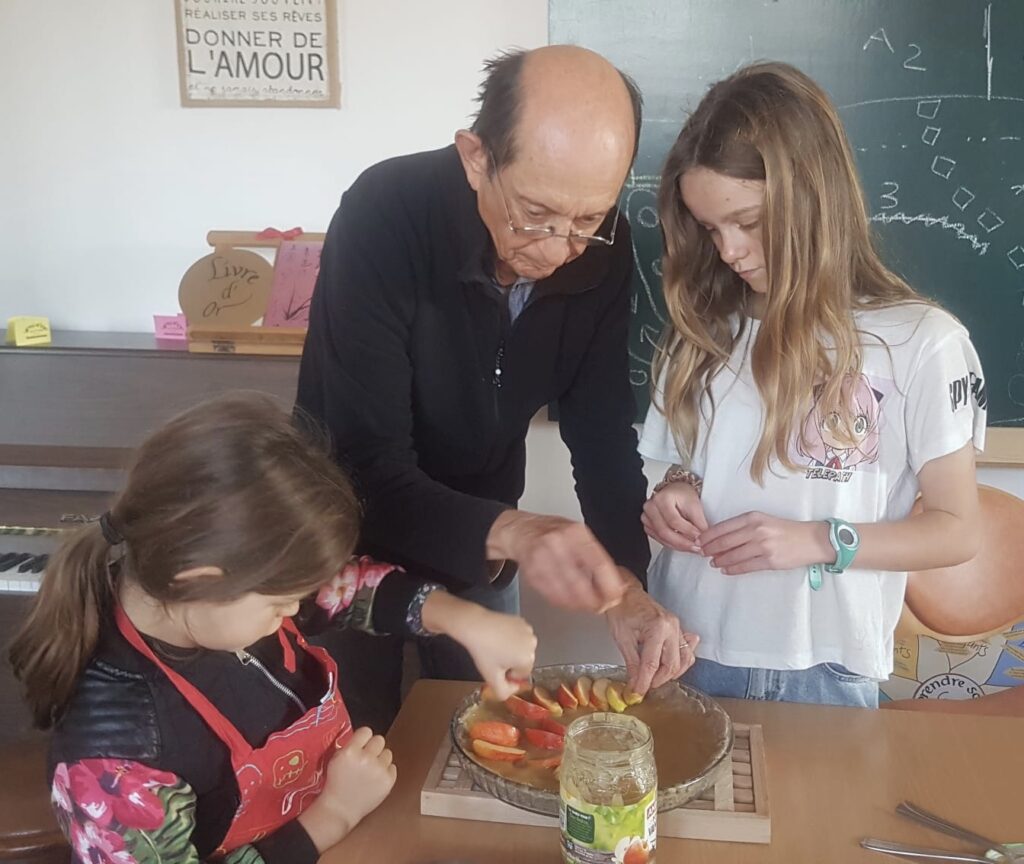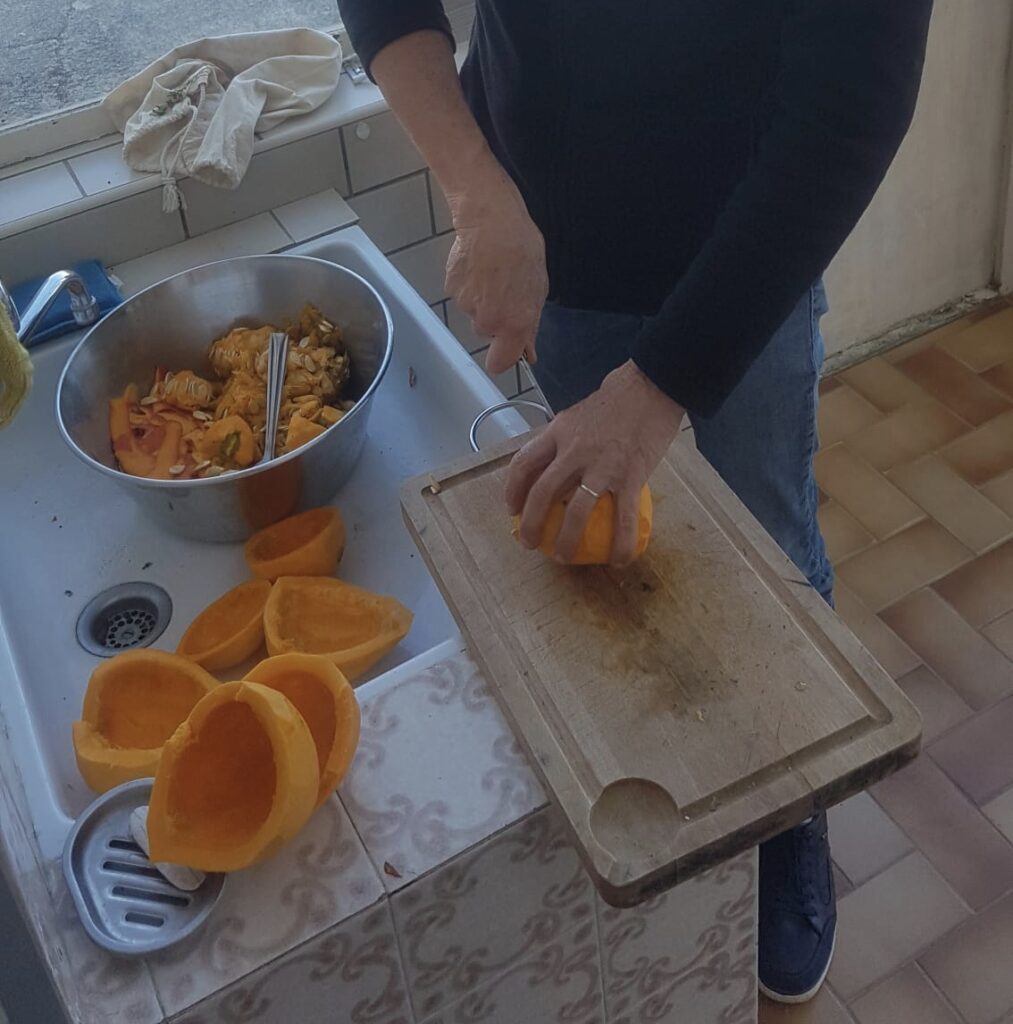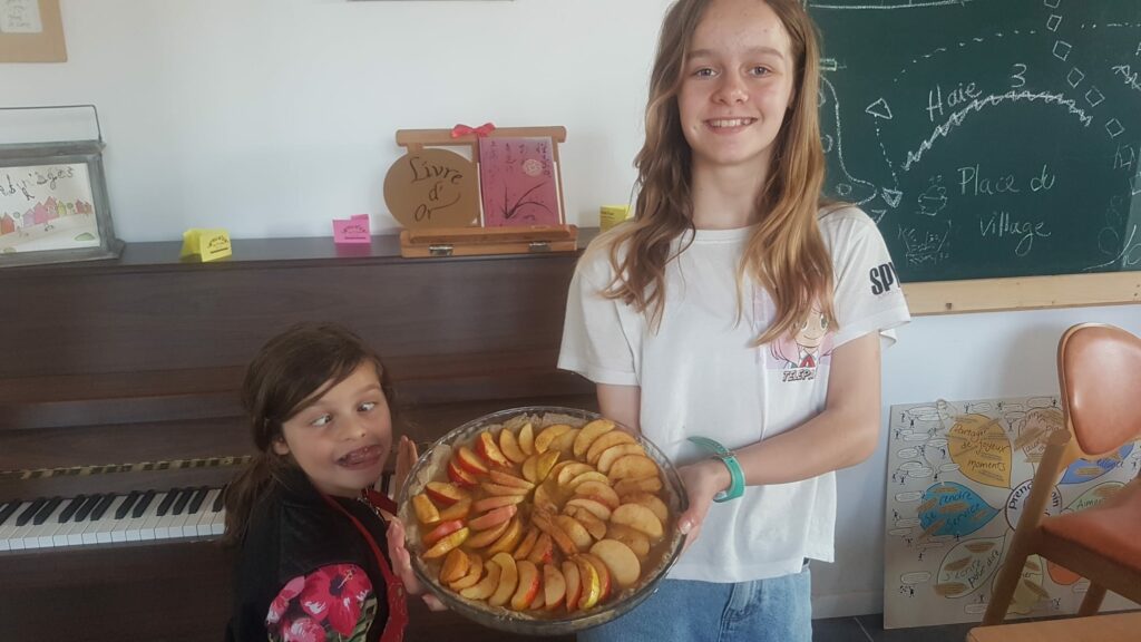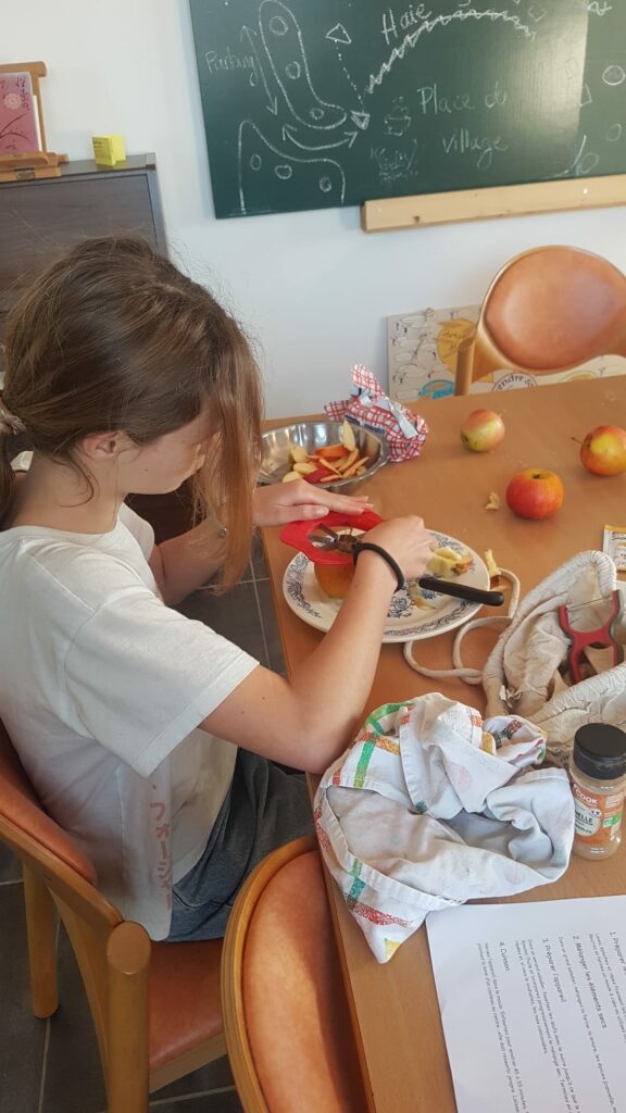 Tandis que les adultes s’affairent à préparer des potages de courges Butternut et de Potimarons, les enfants se concentrent sur une tarte aux pommes.